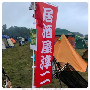 テントに戻って、ケータイ充電しつつ、レポ用のメモを起こしてたけど、居酒屋淳二の幟見た瞬間、「あっ、ここネットで有名な人んとこや!」思ったけど、よく考えたら、俺も界隈ではそれなりに有名だった(苦笑)